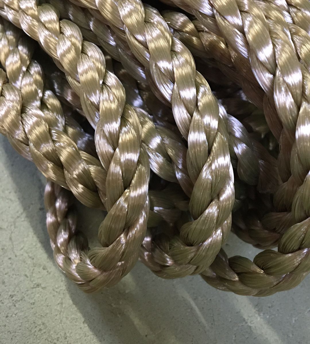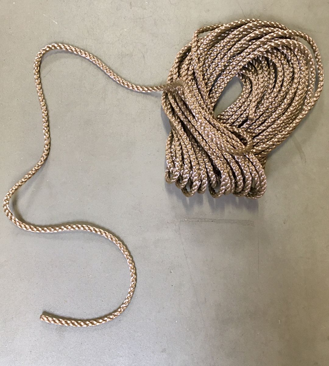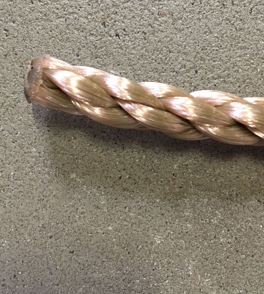 Nylontauet har en diameter på ca. 10 mm. og har et brunt/gyllent utseende.