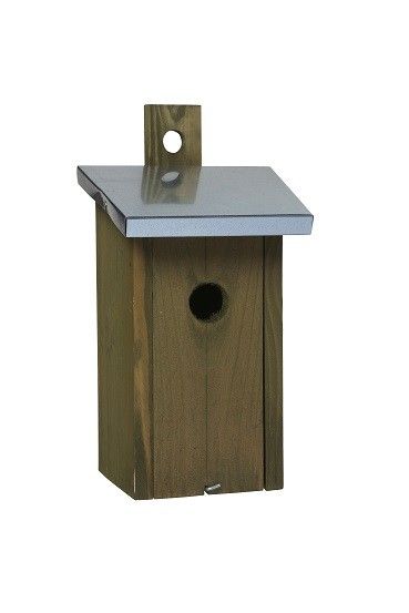 Musvitkasse i olivenbejdset fyr med skråt zink tag. 32 mm hulstørrelse.