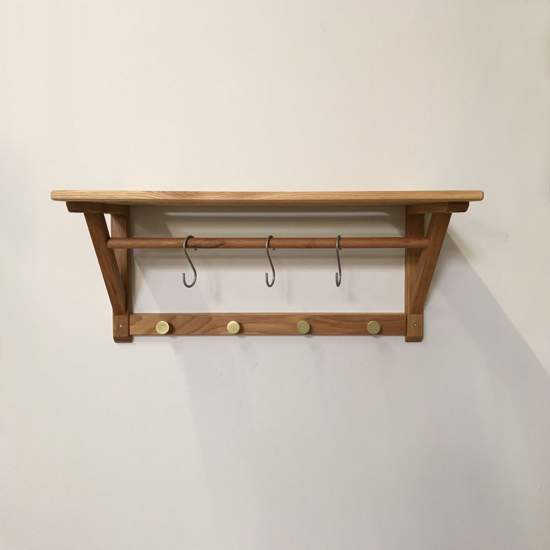 Fin hattehylle i naturlig oljet massivt eik. Designet er enkelt og vakkert. Passer perfekt inn i entreen. 3 s-kroker i matt stål og 4 kroker i messing look medfølger.