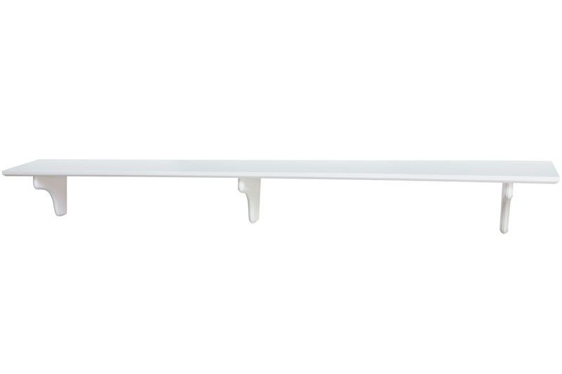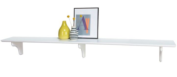 L160 D20 cm. Vegghylle i hvitmalt MDF. (inkl. 3 hylleknekte + festemidler). Maks belastning 15 kg. Finnes i forskjellige størrelser.