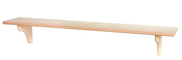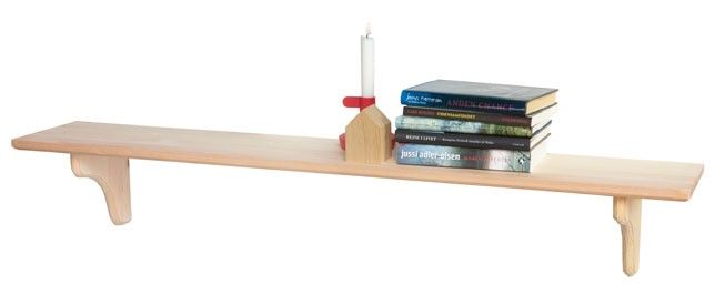 L120 D20 cm. Vegghylle av ubehandlet furu. (inkl. 2 hylleknekte + festemidler). Maks belastning 15 kg. Finnes i forskjellige størrelser.