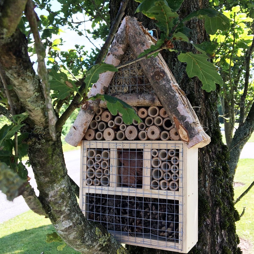 Inviter dyrebare insekter til å bosette seg i hagen eller på balkongen med et insekthotell! Bier, sommerfugler, marihøner og andre småkryp er viktige for det biologiske mangfoldet og trenger et innbydende miljø å leve i. De hjelper til med pollinering av frukt og bær, blomster og planter, og holder skadeinsekter borte. Plasser insekthotellet på et sted der det er beskyttet mot regn og vind, gjerne litt under tak. Det er fint å henge det opp mot øst slik at det får litt morgensol, men ikke direkte sollys hele dagen.