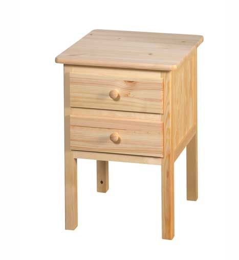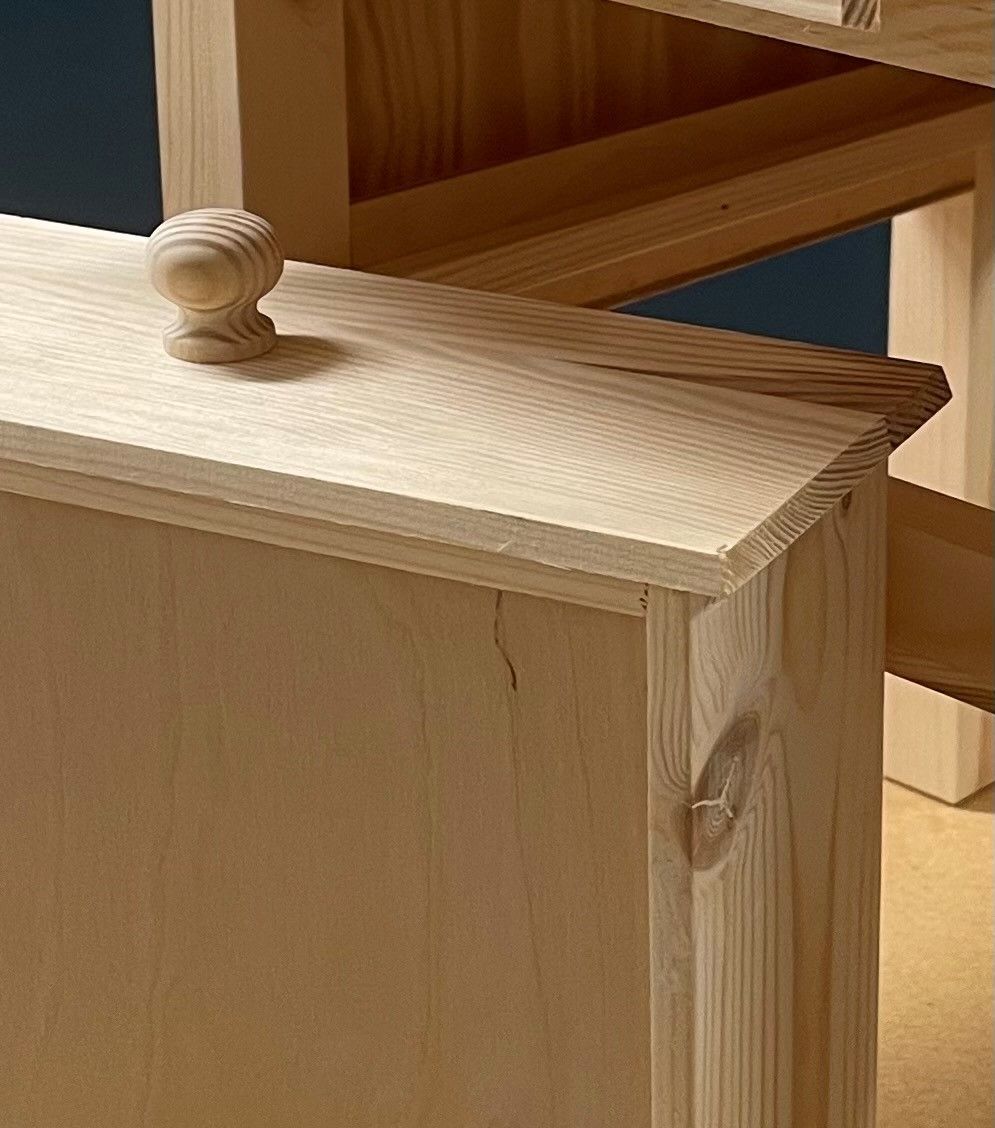 Materialer: Hovedsakelig laget av massiv furu, med sider og skuffebunner i kryssfiner.