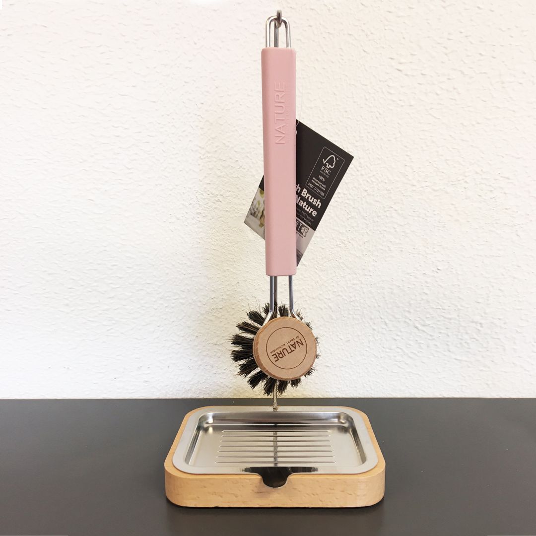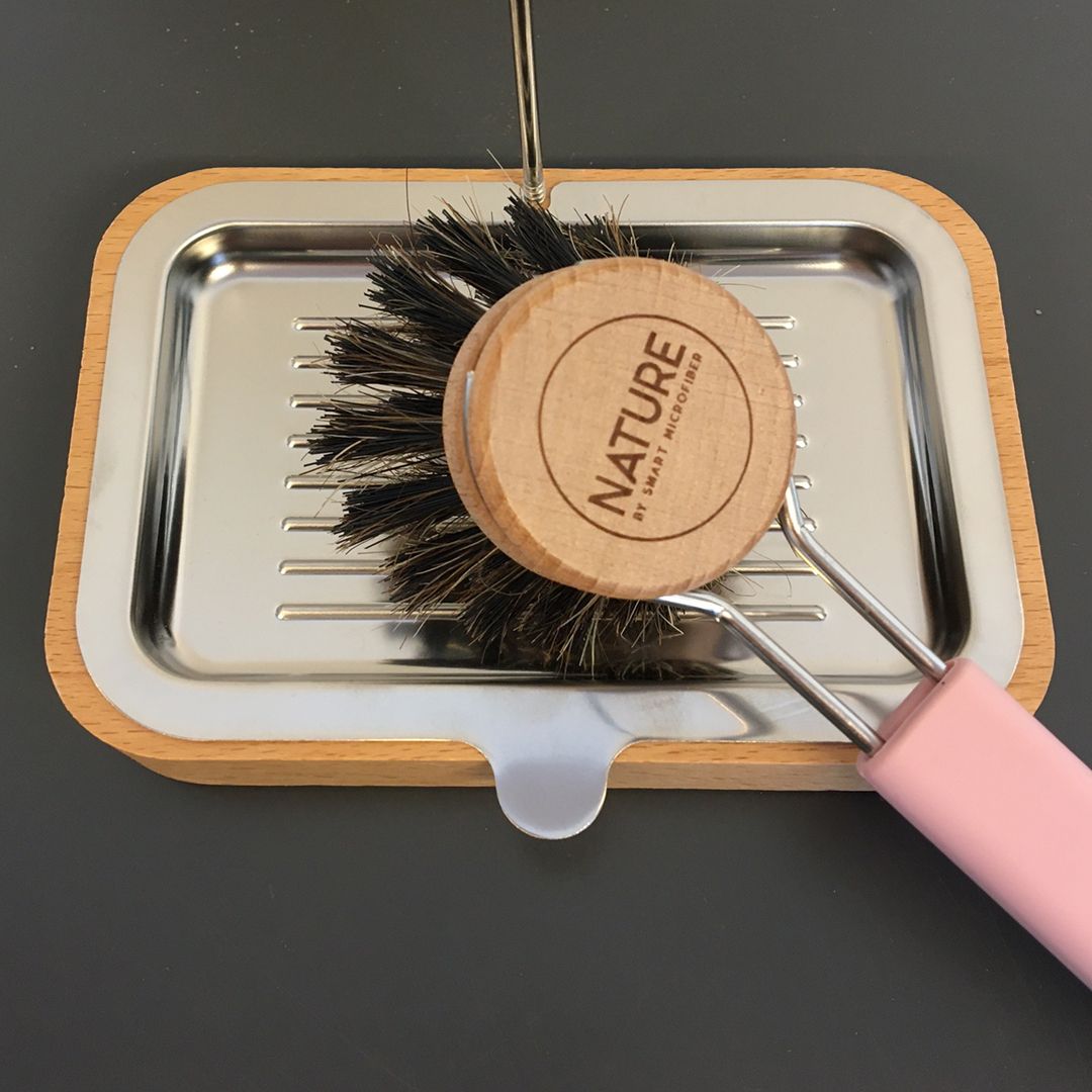 Praktisk holder i tre/metall - så du har kontroll på oppvaskbørsten. Med stang/dryppbrett i metall.